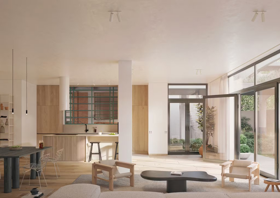 Les arches et chevêtres en béton armé du hangar en intérieur d’îlot sont conservées en partie afin de garantir aux occupants des jardins privés et des espaces communs de qualité. Dans le même esprit, en témoignage de cette typologie structurale unique, la couverture béton est partiellement maintenue : un unique puit de lumière donne sur un espace végétalisé central placé à la transition entre mobilités douces et véhicules motorisés.