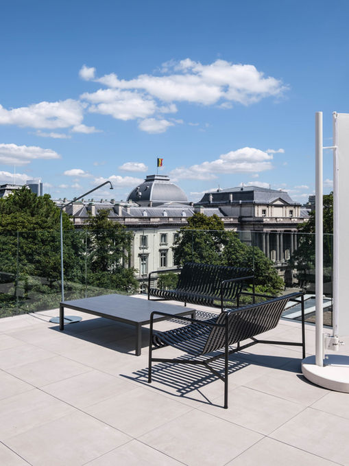 Le programme comprenait également la démolition de la toiture courbe et la création de deux niveaux de terrasses panoramiques offrant une vue surprenante sur Bruxelles et le Palais Royal.